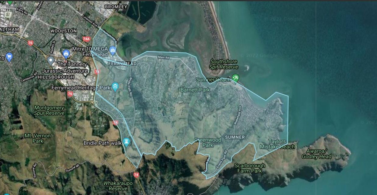 Specifically, the catchment area is defined as the area bounded by Taylors Mistake in the east, the Sumner and Redcliffs waterfront, the south side of Humphreys Drive up to SH74. The east side of the SH74 to the Lyttelton tunnel, the Bridle Path up to the Summit Rd, left along the Summit Rd and down to Taylors Mistake.
